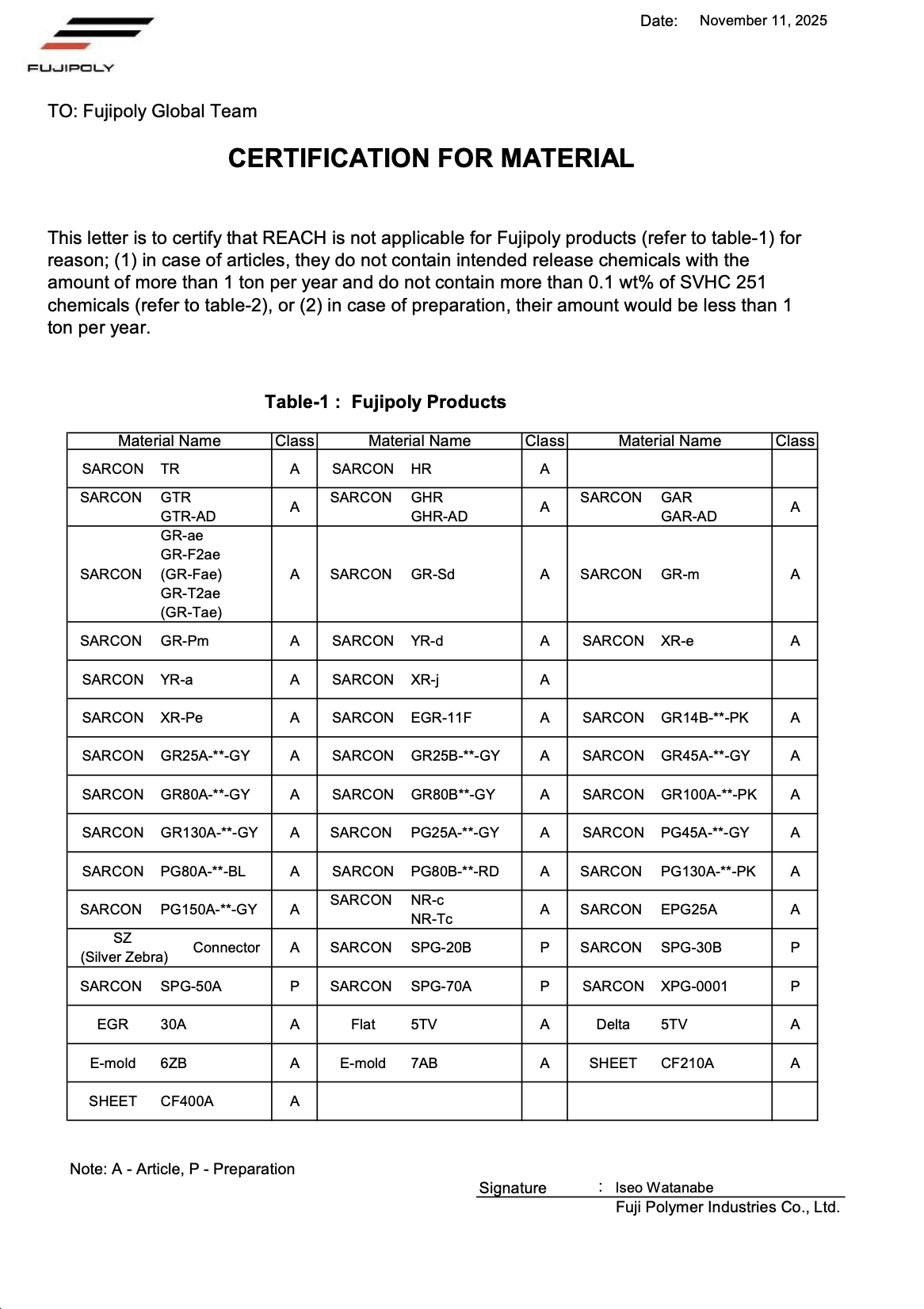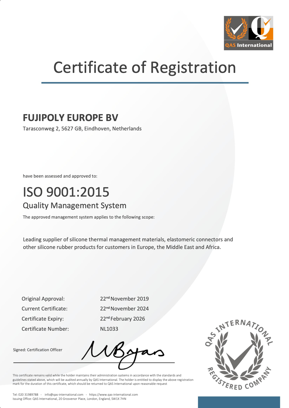 Our company has earned various certificates in the thermal interface material field. Some certifications show parent & sister companies, not FUJIPOLY Europe B.V.